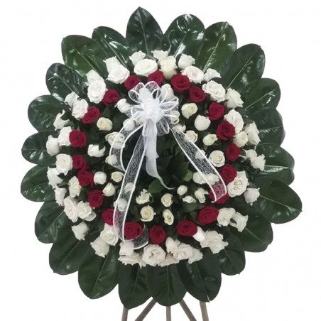 Distinguida corona en pedestal armada con lindas rosas blancas y rojas rodeada de fina hoja verde acompañada de delicada cinta de agua y tarjeta para expresar y acompañar a su ser querido.