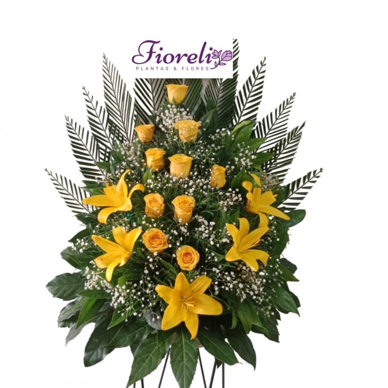 Elegante arreglo floral de condolencia diseñado con lindas rosas blancas y bellos lirios, acompañados de fino follaje verde y tarjeta con mensaje para expresar los más bellos sentimientos a la familia.