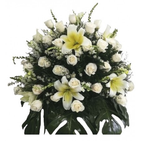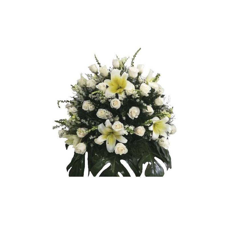 Acompaña a tus seres queridos con este magnífico arreglo floral elaborado con delicadas rosas y hermosos lirios, acompañado de fino follaje verde y tarjeta con mensaje personalizado para la ocasión.