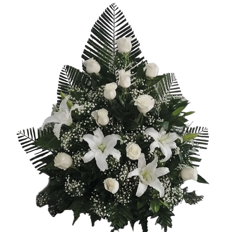 Acompaña a tus seres queridos con este magnífico arreglo floral elaborado con delicadas rosas blancas y lirios blancos acompañado de fino follaje verde y tarjeta con mensaje personalizado para la ocasión.