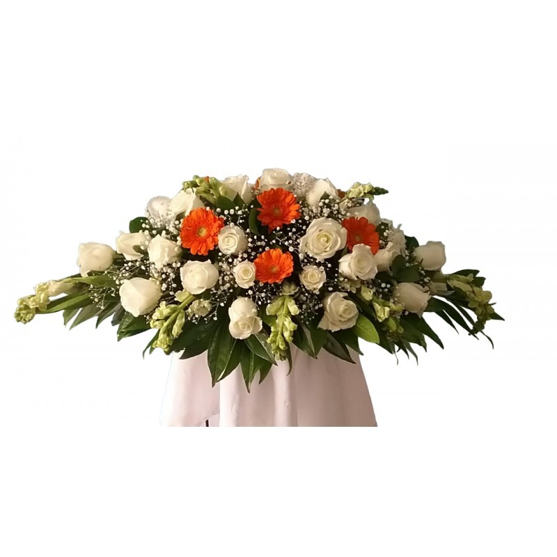 Distinguido tocado para vestir de belleza y elegancia la urna fúnebre, con mensaje solemne para acompañar a la familia.