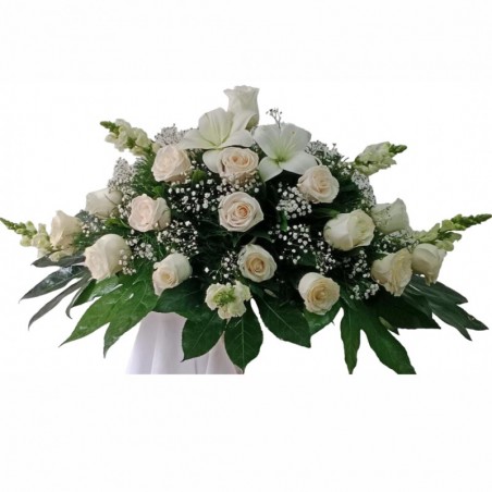 Arreglo de cofre con rosas, lirios y bocas de drangon.
