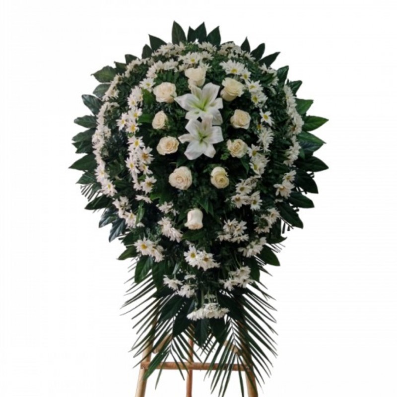 Pedestal fúnebre con margaritas, rosas, lirios y gypsophila.