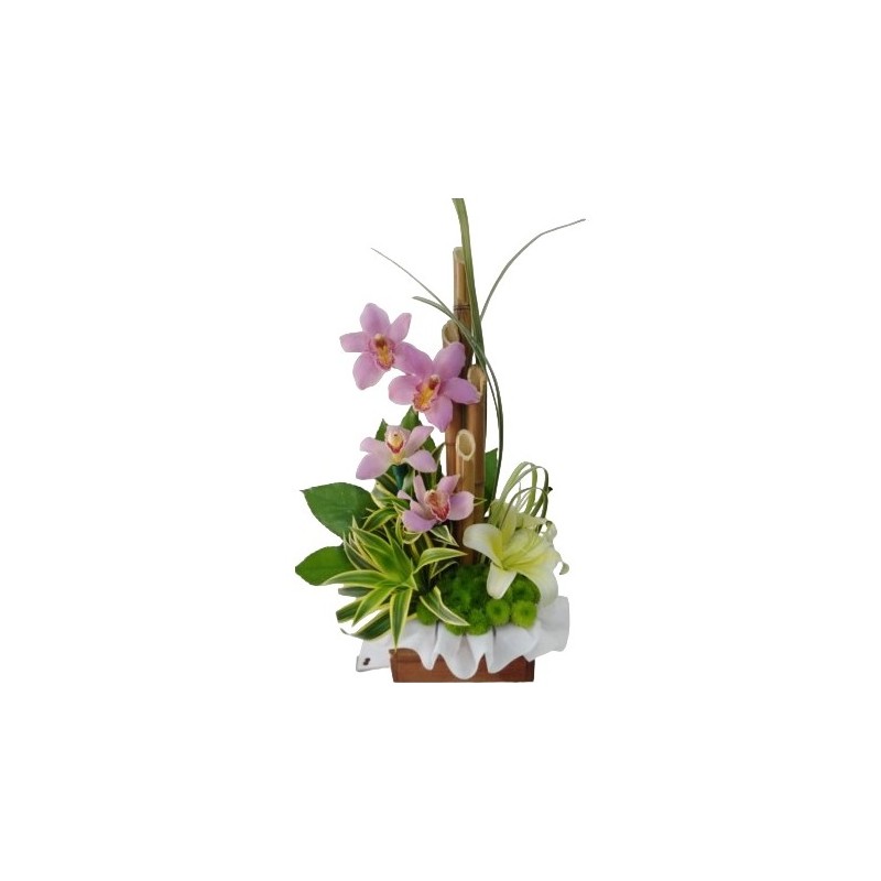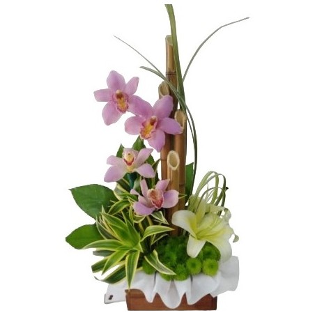 Arreglo florar especial para honra fúnebre y condolencias, elaborado en base de madera con hermosas orquídeas y lirios que aportan elegancia.
