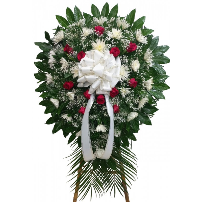Pedestal de condolencias con crisantemos, canción de la india y rosas