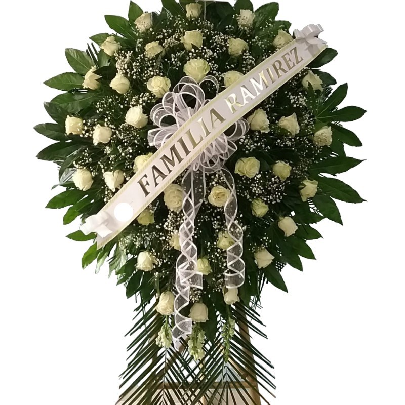 Pedestal fúnebre con rosas, bocas de dragón y gypsophila