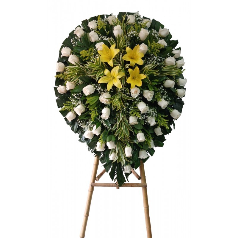 Acompaña a tus seres queridos con este magnífico arreglo floral elaborado con delicadas rosas blancas y lirios amarillos acompañado de fino follaje verde y tarjeta con mensaje personalizado para la ocasión.